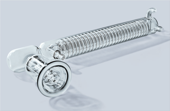 大型加熱蒸留用凝縮器。 蛇管は二重になっている。
