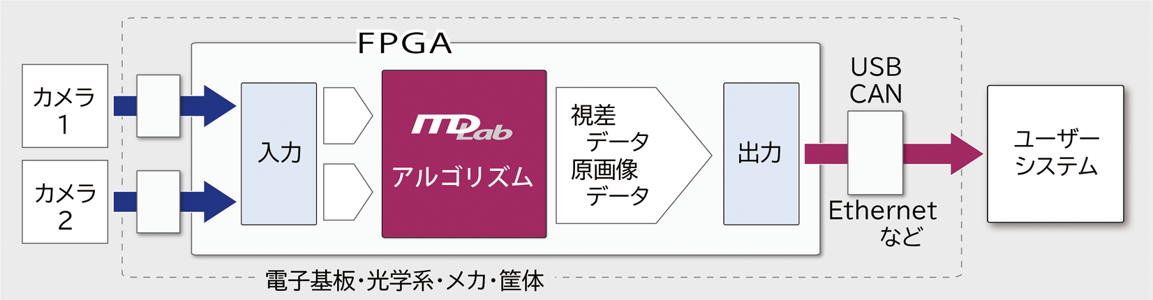 ●複雑な計算をカメラ内蔵FPGAワンチップで全て処理するため、小型・高速・軽量・低消費電力です。