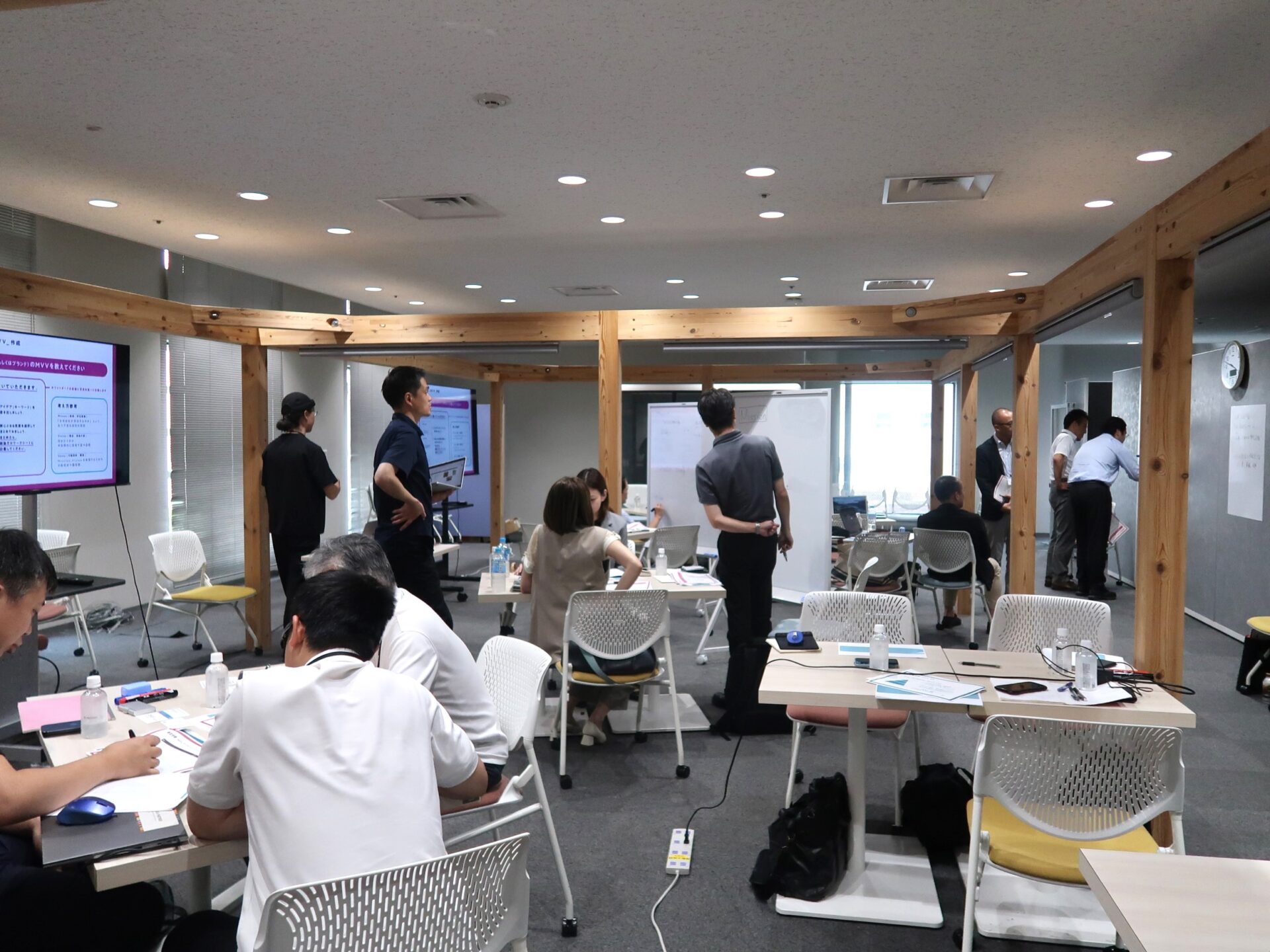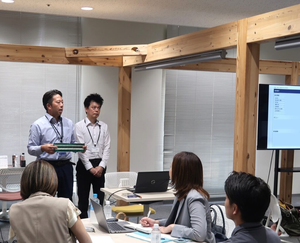 第1回目は8月22日(金)に開催され、製造業やサービス業など7社14名が参加しました。参加企業の自社紹介とオリエンテーションの後、「自社分析・市場分析」をテーマに講義とワークを行いました。「自社分析」では、今後の商品・サービス開発の軸となる自社のブランディングについて、講師が事例を交えて解説。ブランディングがビジネスの進め方に与える影響など、参加者は熱心にメモを取りながら理解を深めました。その後、自社のMVV(Mission/Vision/Value)を考えるワークを実施。会社の存在意義や目指す姿を整理し、自社の考えを言葉にまとめました。