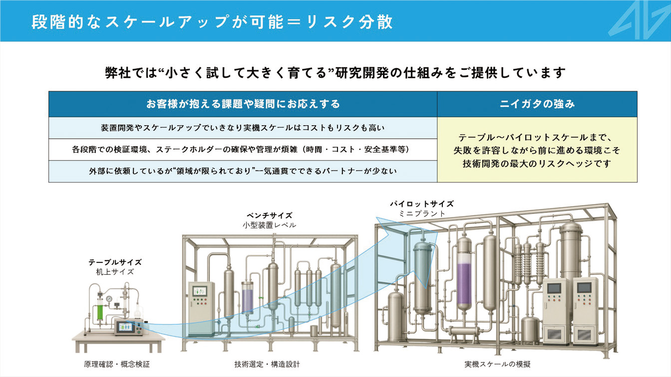 [段階的なスケールアップが可能=リスク分散] 弊社では“小さく試して大きく育てる”研究開発の仕組みをご提供しています。